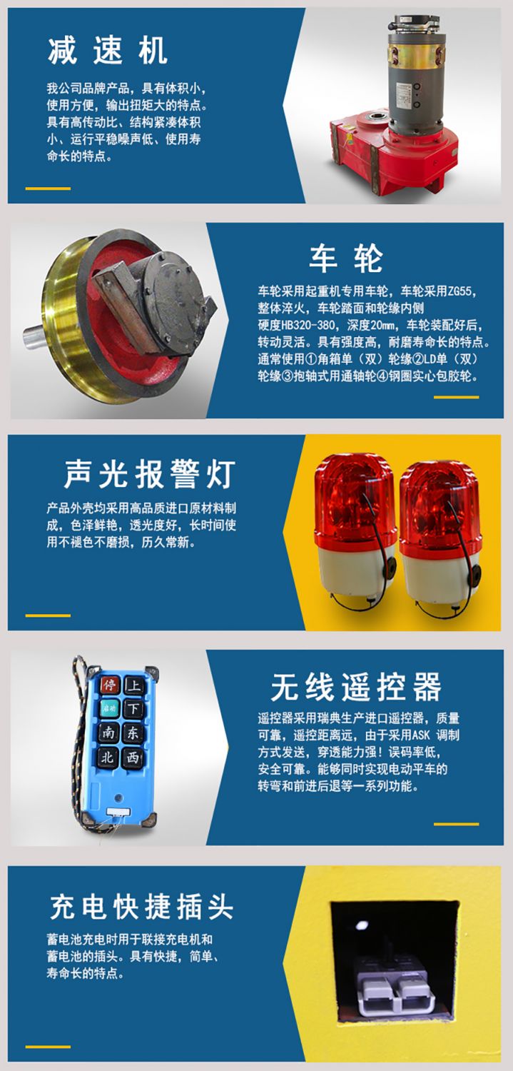 蓄電池供電式軌道電動平車:以蓄電池供電,蓄電池給直流牽引電機提供電力,直流電機拖動平車運行。直流電機與交流電機相比有不易燒損,起動力矩大,過載能力強的優點,運行距離不受限制。
